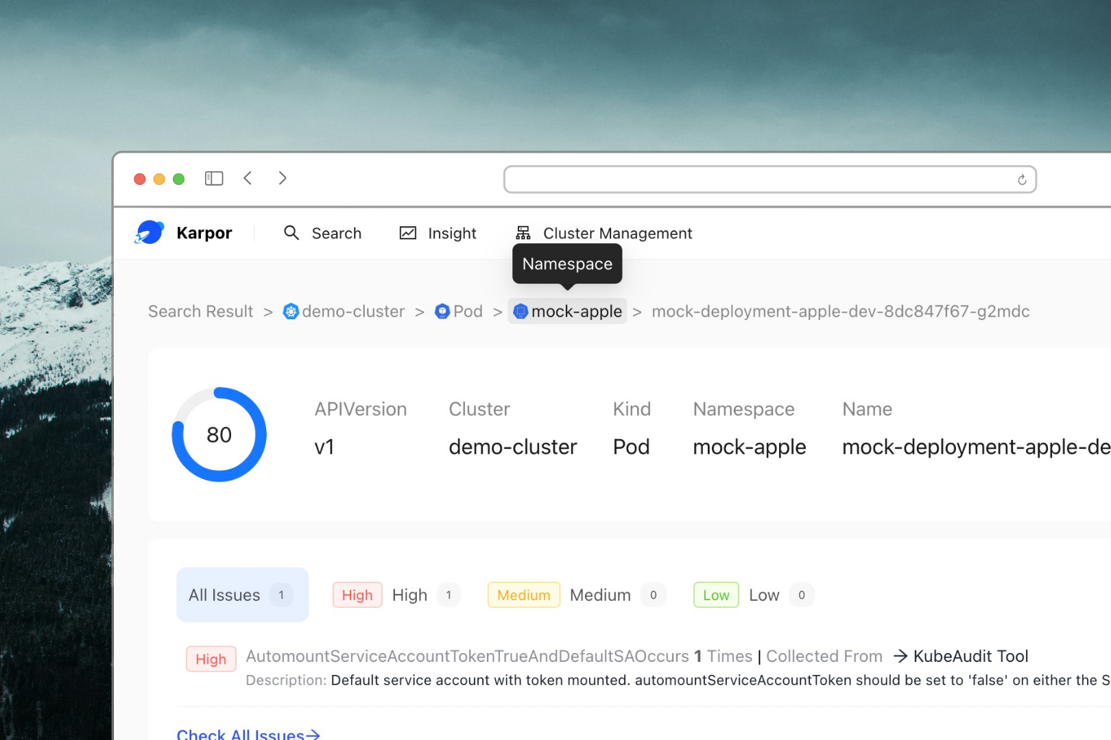 In fact, besides the tags in the mentioned search results, any resource/resource group names you see on any page can be re-directed to as anchor points, which serve like space-time wormholes, allowing you to traverse back and forth through any dimension until you find the resources you are searching for. Both search and anchor points are means to expedite the retrieval, which are key features of Karpor as a Kubernetes Explorer.