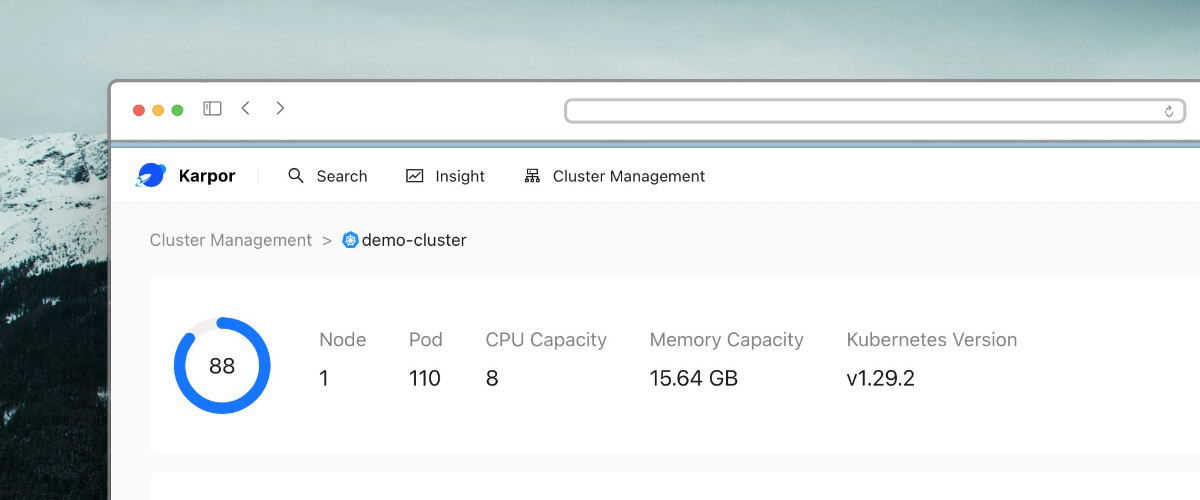 - Cluster Insight Page, the summary card shows the Node, Pod numbers, CPU, memory capacity, and Kubernetes version of the cluster.