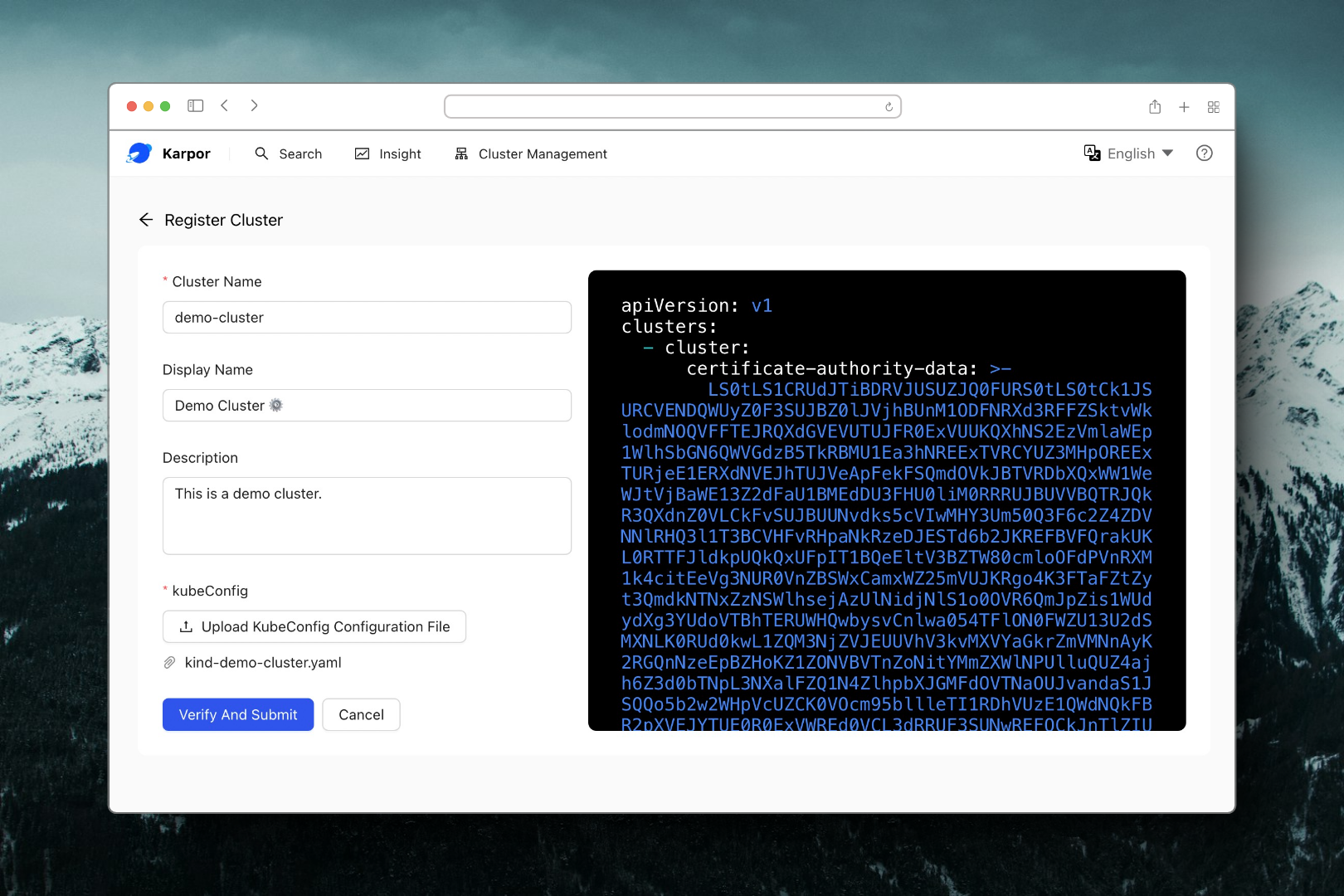 - 确保上传的集群证书中的 server 地址(目标集群地址)与 Karpor 之间有网络连通性。